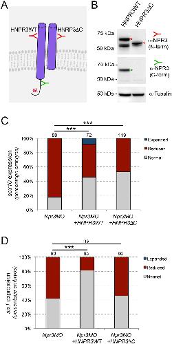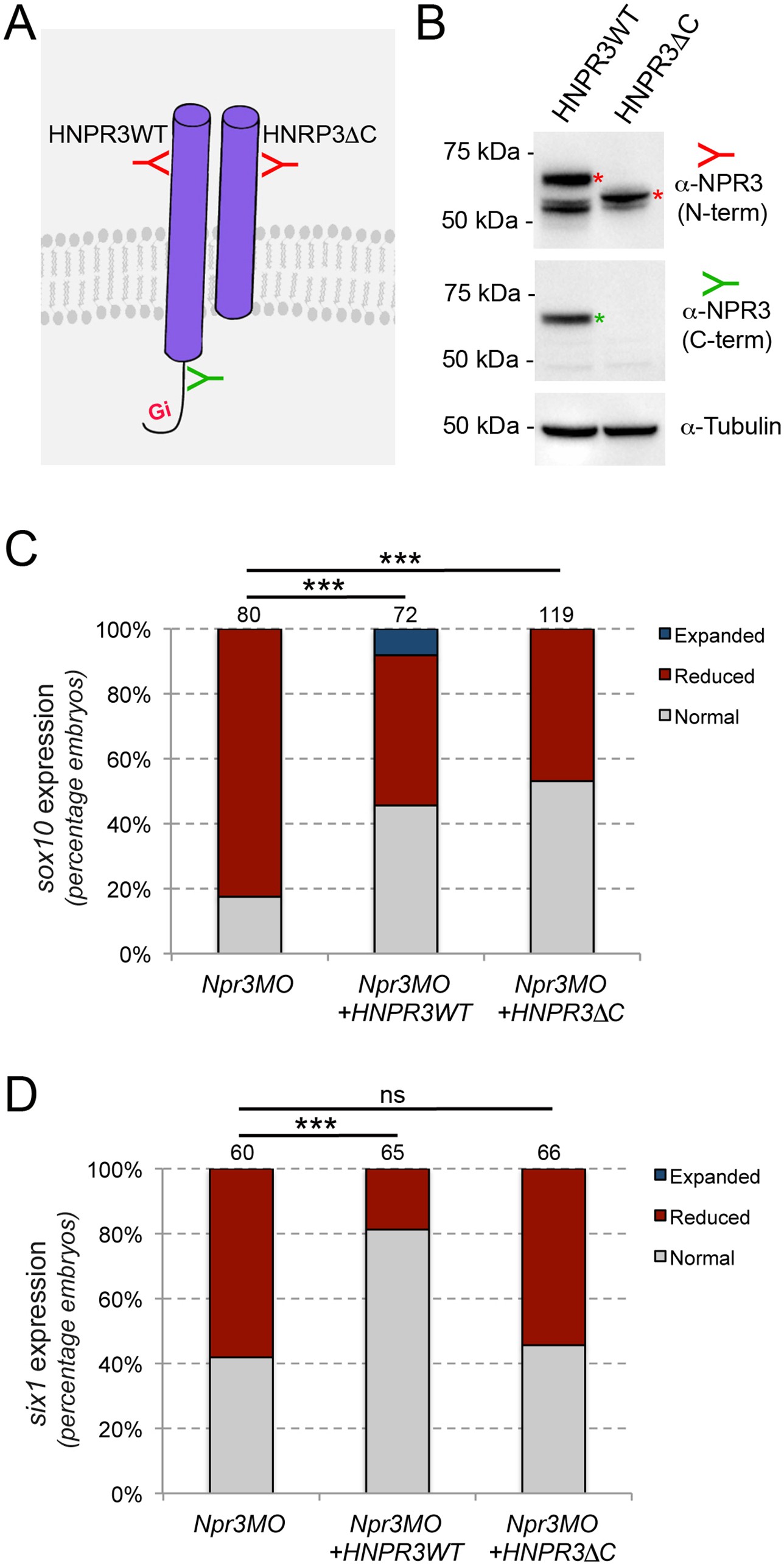 Figure 3. Npr3 regulates NC and CP fate through different mechanisms. (A) Two expression constructs were generated, a wild-type human NPR3 (HNPR3WT) and a truncated version of HNPR3 lacking the C-terminal Gi activator sequence (HNPR3C). (B) Validation of the two constructs. Embryos injected with HNRP3WT or HNRPCC mRNA were analyzed by Western blot using antibodies directed against the C-terminal (ProSci, Cat#42909; green) or N-terminal (Santa Cruz Biotechnology, Cat#sc-515449; red) domains of NPR3. -Tubulin is shown as a loading control. The second band in the HNPR3WT lane may represent a cleaved version of HNPR3 lacking the cytoplasmic tail (not recognized by anti-NPR3 C-term), or alternatively a secreted version of NPR3 lacking the transmembrane domain. (C) HNPR3WT and truncated HNRP3C are equally efficient at rescuing sox10 expression in Npr3-depleted embryos. (D) In contrast, only HNPR3WT is capable of restoring six1 expression in Npr3-depleted embryos. (C,D) Phenotypes quantification is as described in Figure 2. The number of embryos analyzed is indicated at the top of each bar. ***p<0.0005, [Chi-squared] test. ns, not significant. |