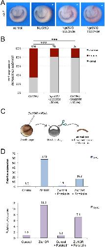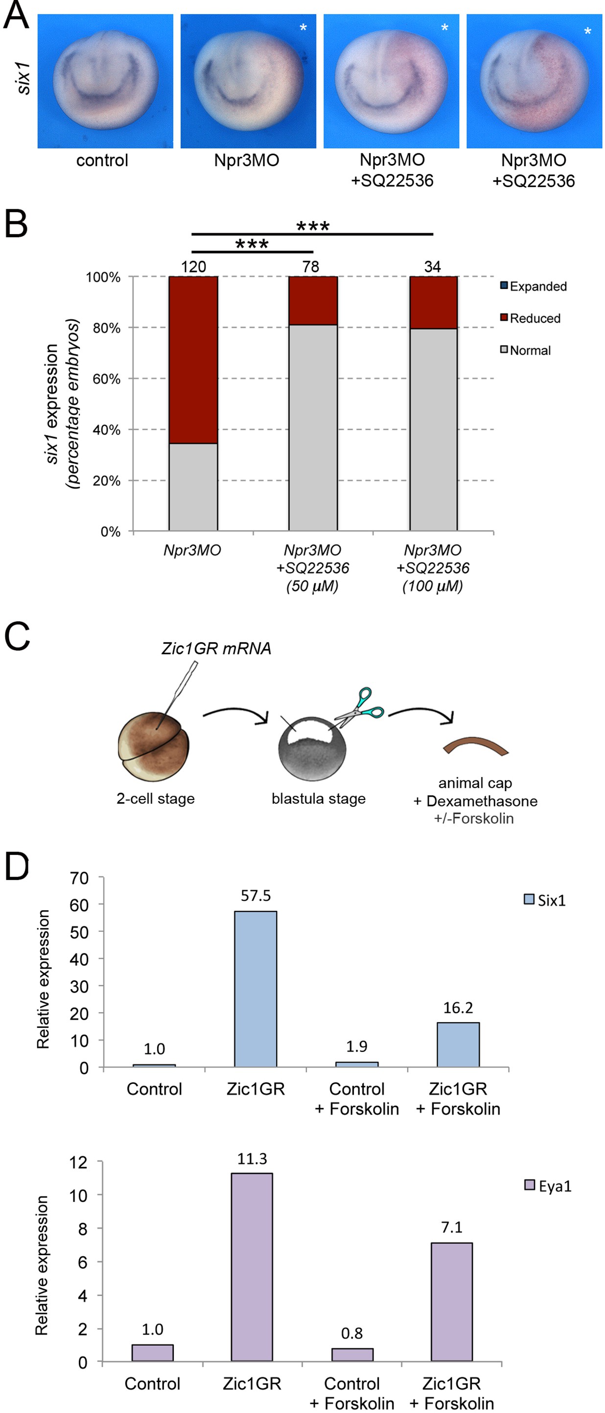 Figure 4. Npr3 requires adenylyl cyclase inhibition to promote CP fate. (A) Inhibition of adenylyl cyclase by treatment with SQ22536 restores six1 expression in Npr3-depleted (Npr3MO) embryos. Two representative embryos are shown to illustrate the range of phenotypes. The asterisks (*) mark the injected side, also visualized by the lineage tracer Red-gal. Anterior views, dorsal to top. (B) Frequency of the phenotypes. The number of embryos analyzed is indicated at the top of each bar. ***p<0.0005, 2 test. (C) Experimental design to test the effect of adenylyl cyclase activation by Forskolin on the CP-inducing activity of Zic1. (D) qRT-PCR analysis of six1 and eya1 expression in animal cap explants injected with Zic1GR mRNA and cultured in the presence of dexamethasone +/-forskolin (50 M). Values are normalized to odc. A representative experiment is shown. Two additional biological replicates are shown in Figure 2. |