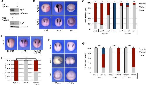Figure 5. Signaling through Npr1 regulates NC and CP formation. (A) Western blot analysis of protein lysates from control embryos and embryos injected with npr1 or npr2 mRNA (1 ng) alone or in combination with the corresponding translation blocking MO, Npr1MO and Npr2MO, respectively. -Tubulin is shown as a loading control. (B) ISH for snai2, sox10 and six1 expression in Npr1MO- and Npr2MO-injected embryos. The asterisks (*) mark the injected side, also visualized by the lineage tracer Red-gal. Dorsal views, anterior to top, except for six1, which shows anterior views, dorsal to top. (C) Frequency of the phenotypes. The number of embryos analyzed for each condition is indicated at the top of each bar. (D) Rescue of Npr1 knockdown phenotype (sox10) by expression of human NPR1 (HNPR1). The asterisks (*) mark the injected side, also visualized by the lineage tracer Red-gal. (E) Frequency of the phenotypes. The number of embryos analyzed is indicated at the top of each bar. ***p<0.0005, [Chi-squared] test. (F) The expression of snai2, twist1, and six1 is reduced upon treatment with A71915, a potent Npr1 antagonist. Dorsal views, anterior to top (snai2). Lateral views, anterior to right (twist1). Anterior views, dorsal to top (six1). (G) Frequency of the phenotypes. The number of embryos analyzed is indicated at the top of each bar. ***p<0.0005, [Chi-squared] test. |