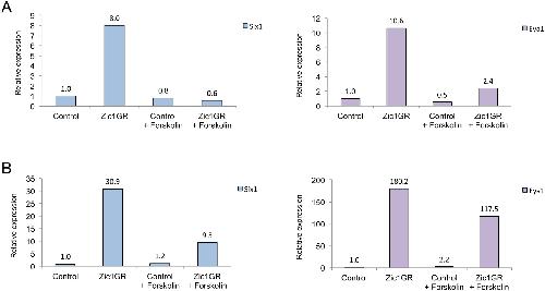 Figure 4—figure supplement 1 Forskolin treatment interferes with six1 and eya1 induction by Zic1GR. qRT-PCR analysis of six1 and eya1 expression in Zic1GR-injected animal caps untreated or treated with 50 μM Forskolin, from two biological replicates (A and B). Expression levels are normalized to odc. |