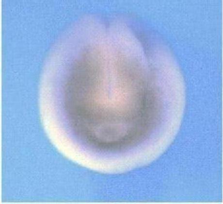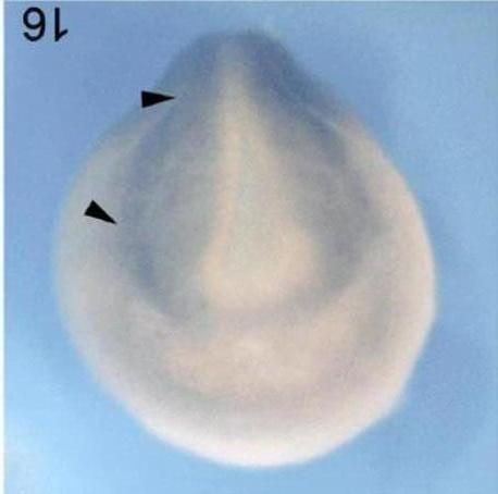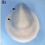 nppc (natriuretic peptide C) gene expression in X. laevis embryo, NF stage 16, assayed via in situ hybridization, anterior view, dorsal up. Key: neural plate border (black arrowheads) |