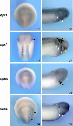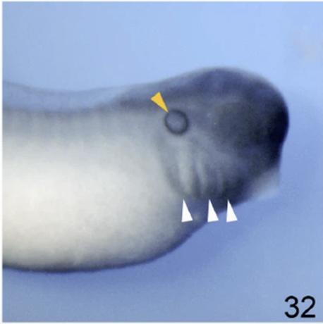 npr1 (natriuretic peptide receptor 1) gene expression in X. laevis embryo, NF stage 32, assayed via in situ hybridization, lateral view, anterior right dorsal up. Key: white arrowheads indicate expression in pharyngeal arches. |