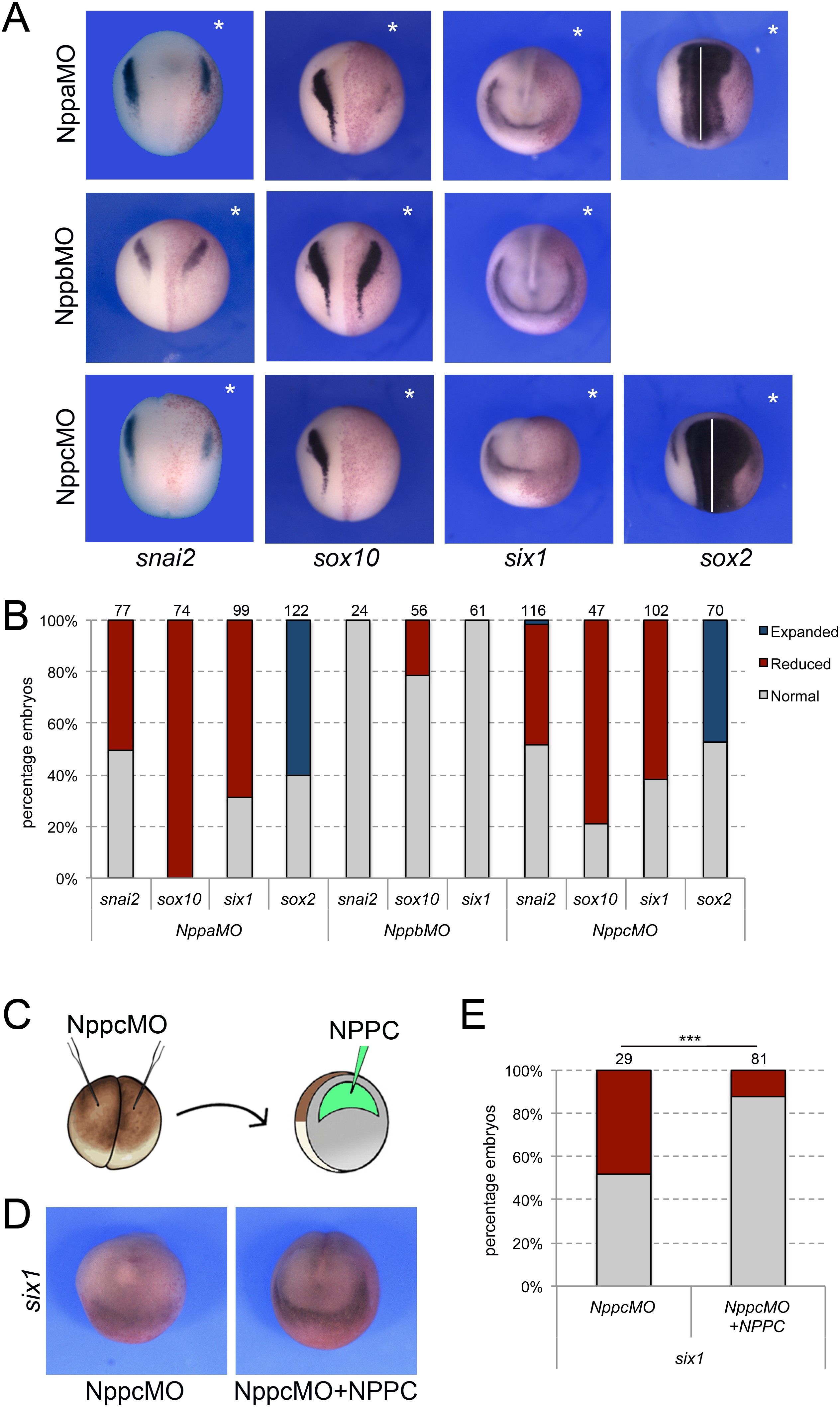 Figure 6. Natriuretic peptides activity during NC and CP formation. (A) ISH for snai2, sox10, six1 and sox2 expression in NppaMO-, NppbMO-, and NppcMO-injected embryos. The asterisks (*) mark the injected side, also visualize by the lineage tracer Red-gal. Dorsal views, anterior to top, except for six1, which shows anterior views, dorsal to top. (B) Frequency of the phenotypes. The number of embryos analyzed for each condition is indicated at the top of each bar. (C) To rescue the phenotype of Nppc morphant embryos, recombinant NPPC was microinjected in the blastocoel cavity of Nppc-depleted embryos. (D) NPPC can restore six1 expression in NppcMO-injected embryos. Anterior views, dorsal to top. (E) Frequency of the phenotypes. The number of embryos analyzed is indicated at the top of each bar. ***p<0.0005, [Chi-squared] test. |