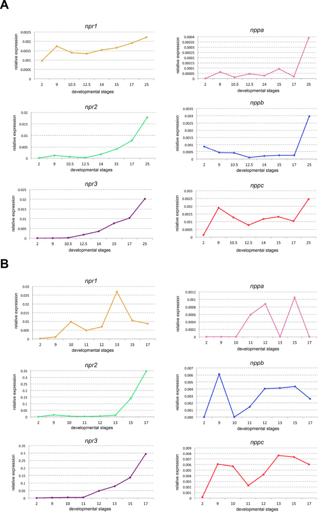 Figure 1—figure supplement 1. Developmental RT-PCR of natriuretic peptide signaling pathway components.Developmental qRT-PCR expression profile of npr1, npr2, npr3, nppa, nppb and nppc in two biological replicates (A and B) of WT Xenopus embryos. NF stages are indicated on x-axis, values are normalized to odc. |