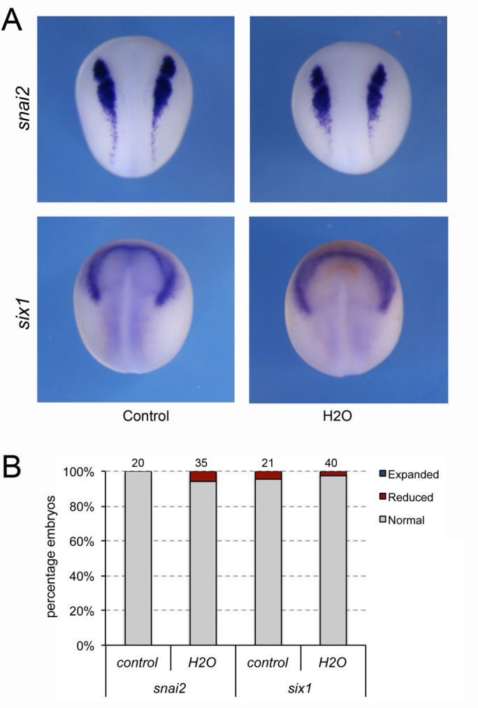 Figure 2—figure supplement 1 Manipulation of the blastocoel fluid does not affect snai2 and six1 expression. (A) The expression of snai2 and six1 is unaffected in embryos in which the blastocoel fluid was replaced by 100–120 nl of water at NF stage 9. Dorsal views, anterior to top. (B) Frequency of the phenotypes. The number of embryos analyzed is indicated at the top of each bar. |