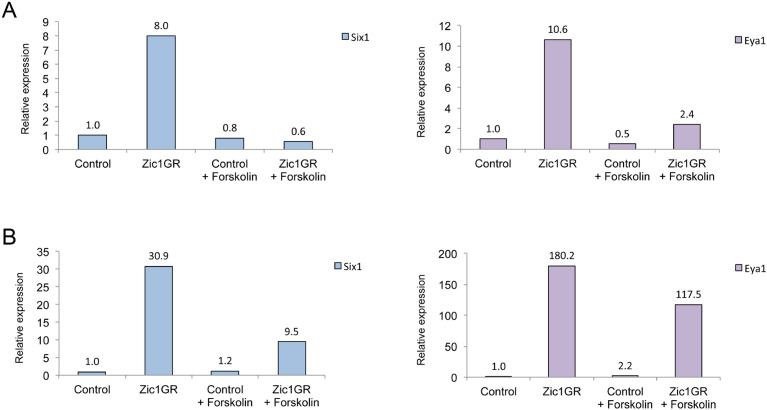 Figure 4—figure supplement 1. Forskolin treatment interferes with six1 and eya1 induction by Zic1GR.qRT-PCR analysis of six1 and eya1 expression in Zic1GR-injected animal caps untreated or treated with 50 μM Forskolin, from two biological replicates (A and B). Expression levels are normalized to odc. |