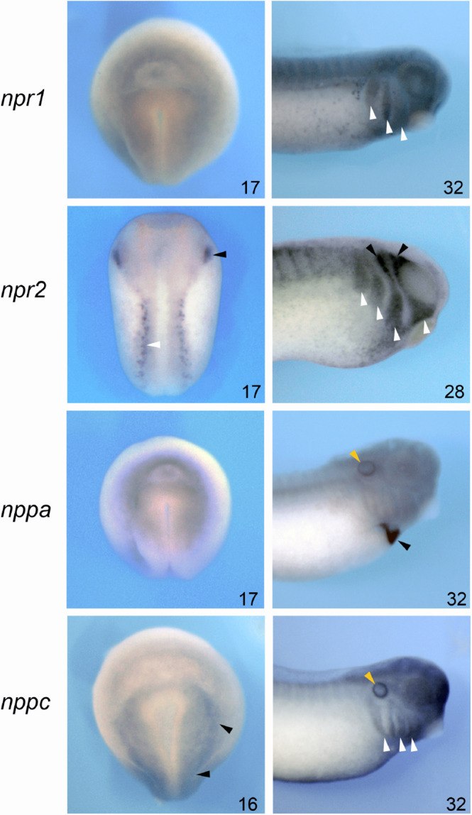 Figure 5—figure supplement 1 Spatial expression of npr1, npr2, nppa and nppc by whole-mount ISH. Spatial expression of npr1, npr2, nppa, and nppc by whole-mount ISH at neurula (NF stage 15/16) and tailbud (NF stage 28/32) stages. The embryonic stages are indicated in the lower right corner of each panel. npr1 is broadly expressed at the neurula stage, and becomes enriched dorsally and anteriorly at the tailbud stage. In the head region it is detected in the branchial arches (white arrowheads). At neurula stage, npr2 is detected in the trigeminal placode (black arrowhead) and Rohon-Beard neurons (white arrowhead). Later in development, npr2 is detected in the trigeminal/profundal ganglion complex (black arrowhead) and in the branchial arches (white arrowheads). nppa appears to be diffusely expressed at neurula stage, and at tailbud stage nppa is exclusively restricted to the developing heart (black arrowhead) and otic vesicle (yellow arrowhead). At neurula stage, nppc is enriched at the neural plate border (black arrowheads), and at tailbud stage it is enriched in the prospective epibranchial placodes (white arrowheads) and otic vesicle (yellow arrowhead). Left column, dorsal views anterior to top. Right column, lateral views, anterior to right dorsal to top. |