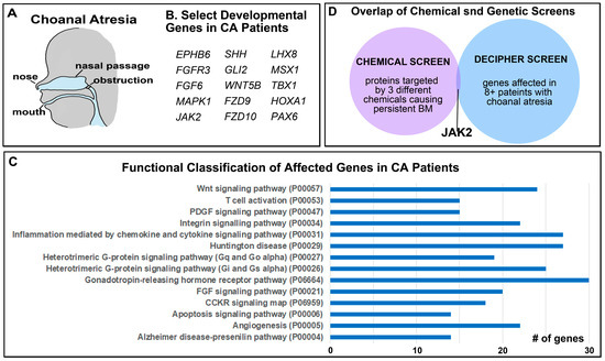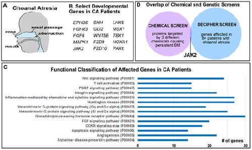 Figure 2. Copy Number Variants in patients with Choanal Atresia. (A) Schematic showing where the airway blockage can occur in Choanal Atresia. (B) Select genes with copy number deletions identified in patients with Choanal Atresia known to be important in development. (C) The top functional categories identified from copy number deletions in patients with Choanal Atresia. The GO identifier is in brackets. (D) Overlap in genes identified in the chemical and genetic screens identifies JAK2. Abbreviations: # = number.