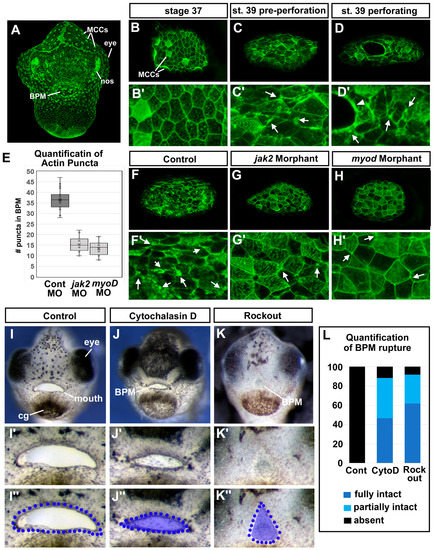 Figure 6. Actin dynamics and buccopharyngeal perforation. (A–G) Actin dynamics revealed by phalloidin labeling during buccopharyngeal membrane perforation. (A) Shows a frontal view of the face at stage 39 (representative from 30 embryos in 4 biological replicates). (B) The buccopharyngeal membrane at stage 37 when the mouth shape is round. (C) The buccopharyngeal membrane at stage 39 just prior to perforation. Note the puncta spots and accumulation of F-actin (white arrows). (D) The buccopharyngeal membrane during perforation shows accumulation of F-actin surrounding the holes. (E–H’) The buccopharyngeal membranes of control morphants (F), jak2 morphants (G), and myod morphants (H). (I–K’’) Images of representative embryos after treatment with cytochalasin D (1 μM) and Rockout (100 μM) from stages 37–40. Quantification of buccopharyngeal membrane rupture in embryos exposed to actin inhibitors shown in (L) (n = 60, 3 biological replicates).