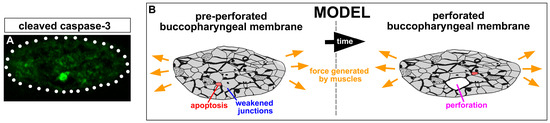 Figure 7. Apoptosis and Model: (A) Cleaved caspase-3-positive cell (green) in the buccopharyngeal membrane pre-perforation (representative of 9 embryos, n = 20, 2 biological replicates). (B) Forces from the muscles generate tension on the buccopharyngeal membrane. Weakened spots, caused by weakened junctions and selective apoptosis, then permit the cells to be broken apart, allowing perforation.