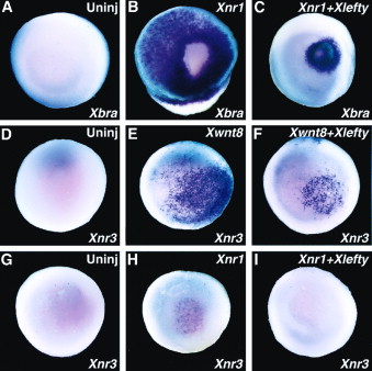 Figure 4. Xlefty Acts at a Distance to Inhibit Endogenous Nodal- and Wnt-Responsive Gene Expression.