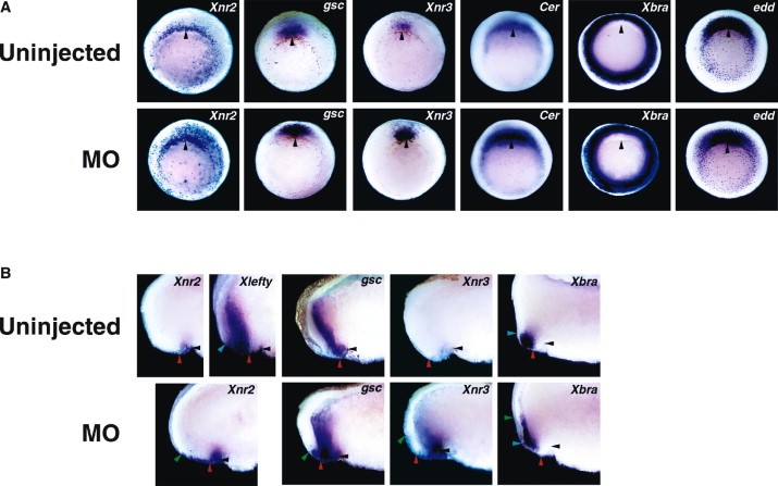 (MO) albino embryos, respectively. gsc and Xbra were examined