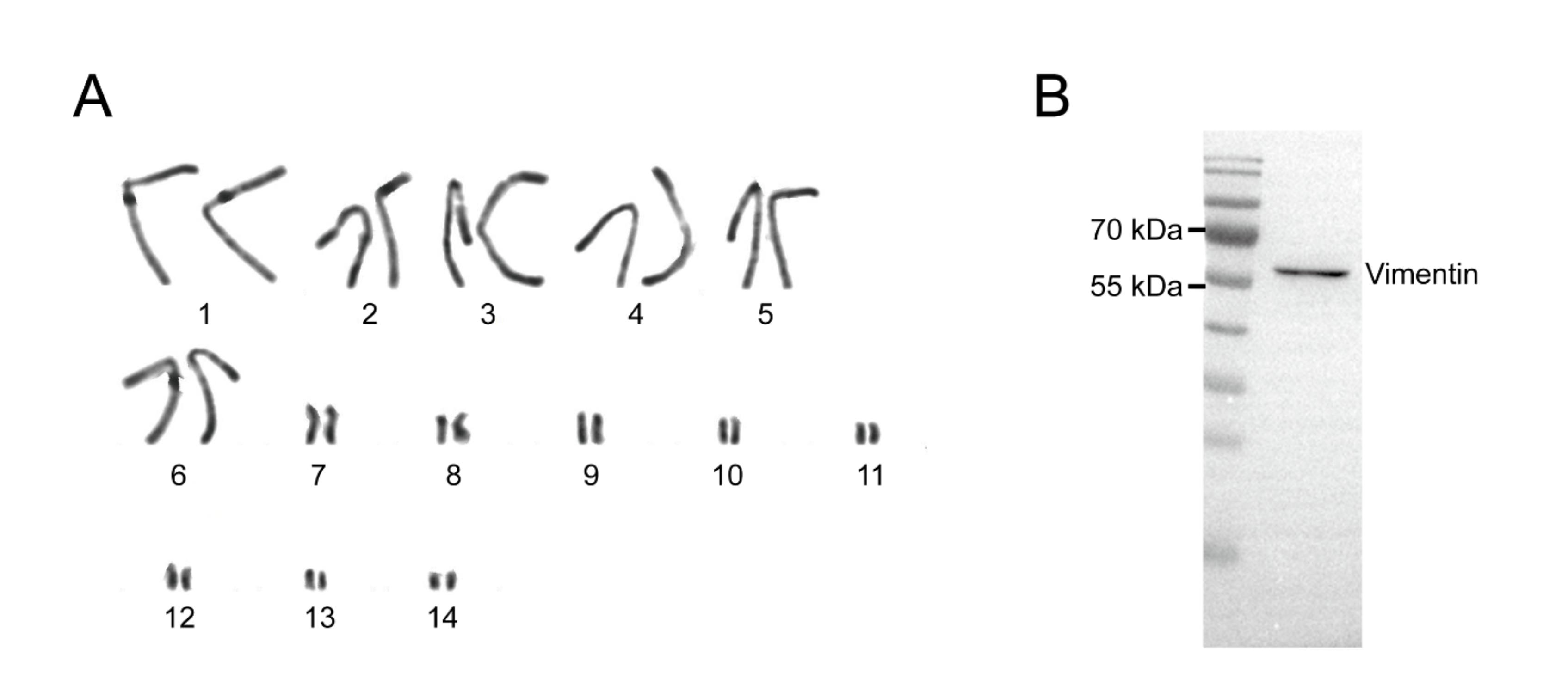 A: Diploid karyotype of cultured BMDF. B: Western blot detection of vimentin in cultured BMDF lysate.