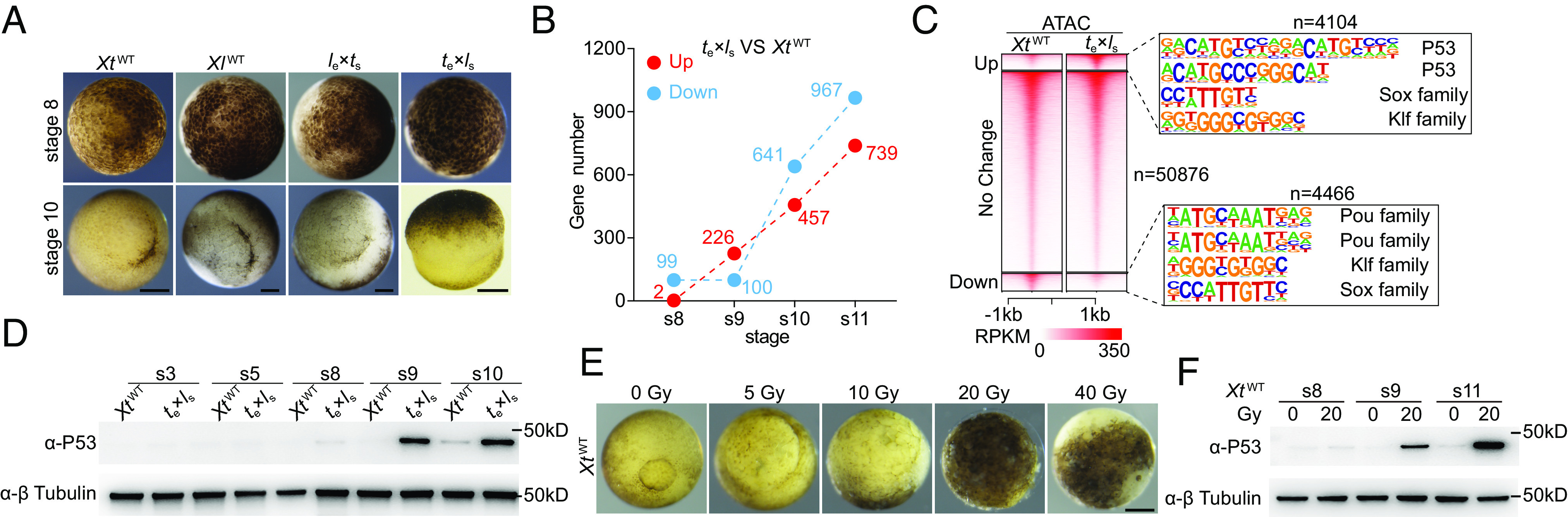 Hybrid incompatibility as a kind of reproductive isolation contributes to speciation. The nucleocytoplasmic incompatibility between Xenopus tropicalis eggs and Xenopus laevis sperm (te×ls) leads to specific loss of paternal chromosomes 3L and 4L. The hybrids die before gastrulation, of which the lethal causes remain largely unclear. Here, we show that the activation of the tumor suppressor protein P53 at late blastula stage contributes to this early lethality. We find that in stage 9 embryos, P53-binding motif is the most enriched one in the up-regulated Assay for Transposase-Accessible Chromatin with high-throughput sequencing (ATAC-seq) peaks between te×ls and wild-type X. tropicalis controls, which correlates with an abrupt stabilization of P53 protein in te×ls hybrids at stage 9. Inhibition of P53 activity via either tp53 knockout or overexpression of a dominant-negative P53 mutant or Murine double minute 2 proto-oncogene (Mdm2), a negative regulator of P53, by mRNA injection can rescue the te×ls early lethality. Our results suggest a causal function of P53 on hybrid lethality prior to gastrulation.