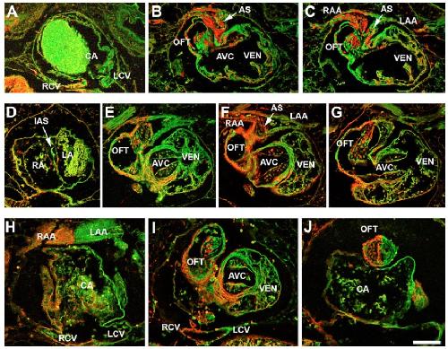 are indicated. The hearts in A-C and H-J each contain