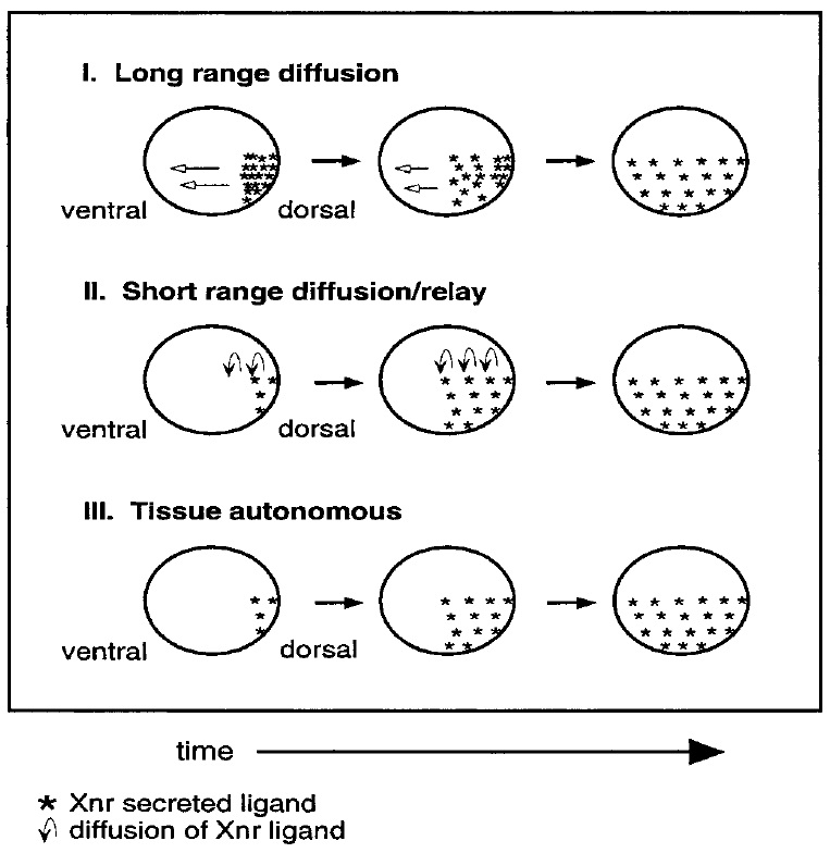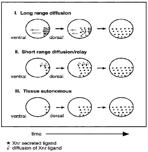 The classical three-signal model of amphibian mesoderm induction and more recent modifications together propose that an activin-like signaling activity is uniformly distributed across the vegetal half of the Xenopus blastula and that this activity contributes to mesoderm induction. In support of this, we have previously shown that the activin-response element (DE) of the goosecoid promoter is uniformly activated across the vegetal half of midgastrula-stage embryos. Here, we further examine the nature of this activity by measuring DE activation by endogenous signals over time. We find that the spatiotemporal pattern of DE activation is much more dynamic than was previously appreciated and also conclude that DE(6X)Luc activity reflects endogenous nodal signaling in the embryo. Using both the DE(6X)Luc construct and endogenous Xbra and Xgsc expression as read-outs for nodal activity, and the cleavage-mutant version of Xnr2 (CmXnr2) to regionally suppress endogenous nodal activity, we demonstrate that nodal signals act cell-autonomously in Xenopus gastrulae. Nodal-expressing cells are unable to rescue either reporter gene activation or target gene expression in distant nodal-deficient cells, suggesting that nodals function at short range in this context. Finally, we show that DE activation by endogenous signals occurs in the absence of dorsal beta-catenin-mediated signaling, but that the timing of dorsal initiation is altered. We conclude that nodal signals in Xenopus gastrulae function cell autonomously at short ranges and that the spatiotemporal pattern of this signaling along the dorsoventral axis is regulated by maternal Wnt-like signaling.