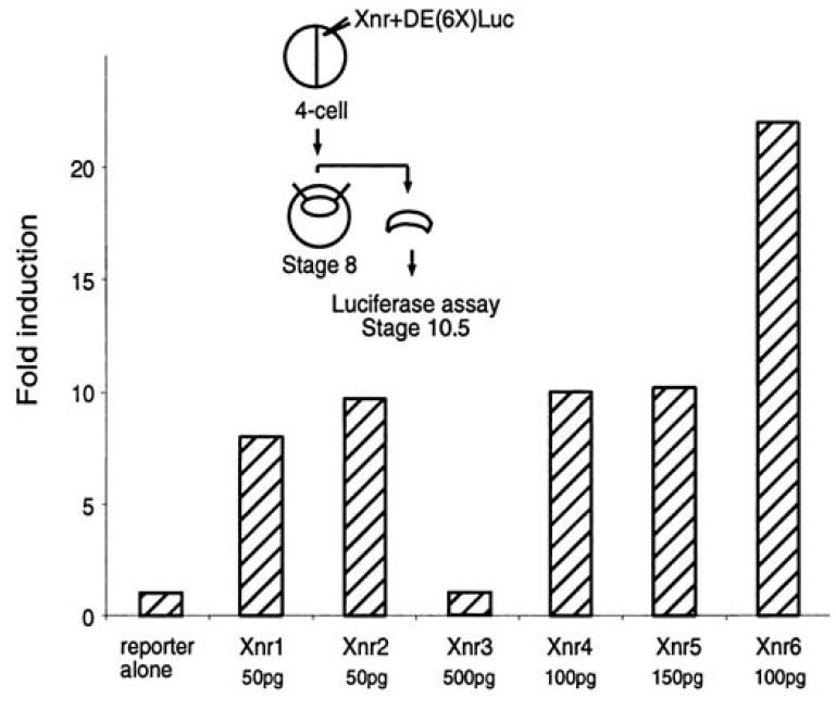 caps. Xnr mRNAs and 6X(DE)Luc reporter were injected into the