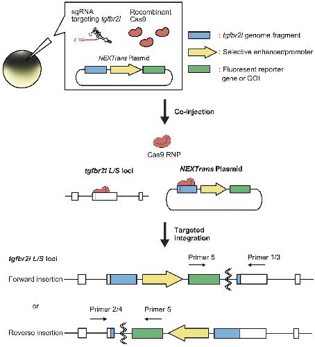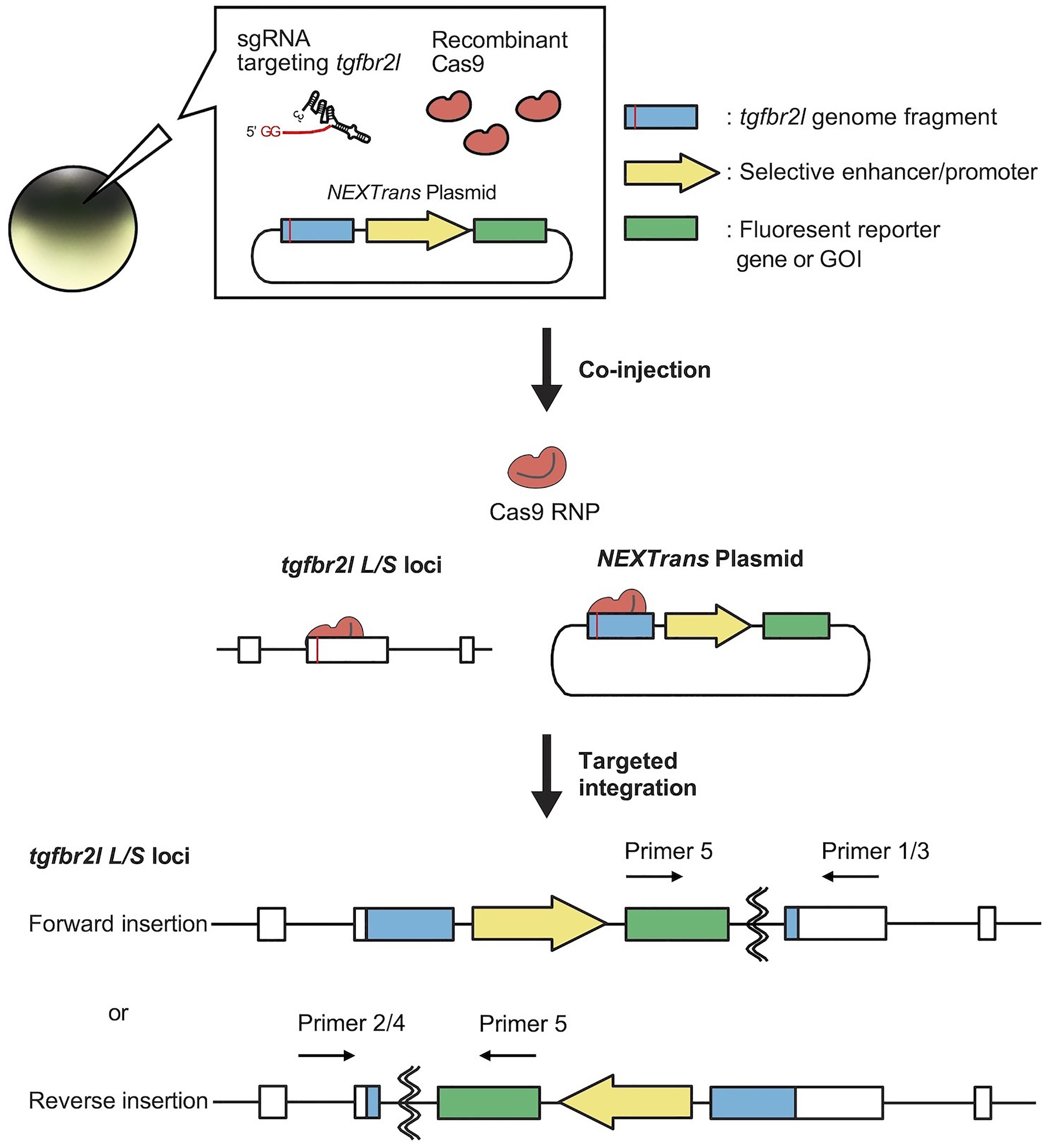 Figure 2. Schematic representation of NEXTrans (New and Easy Xenopus Transgenesis) at a novel harbor siteThe NEXTrans plasmid carrying the transgene cassette is co-injected into fertilized Xenopus laevis eggs with Cas9 RNP targeting the tgfbr2l.L and tgfbr2l.S loci (exon 4). The plasmid integrates into the target sites in the zygotic genome in a forward and/or reverse direction by NHEJ repair during the early embryonic stage and can be detected by PCR. Primer pairs were used for PCR genotyping to detect the Tg(NEXT-fgk:egfp) integration as follows: primers 1 and 5 for tgfbr2l.L forward insertion, primers 2 and 5 for tgfbr2l.L reverse insertion, primers 3 and 5 for tgfbr2l.S forward insertion, and primers 4 and 5 for tgfbr2l.S reverse direction (see key resources table). |