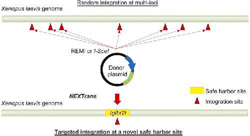 Figure 2. Schematic representation of NEXTrans (New and Easy Xenopus Transgenesis) at a novel harbor site