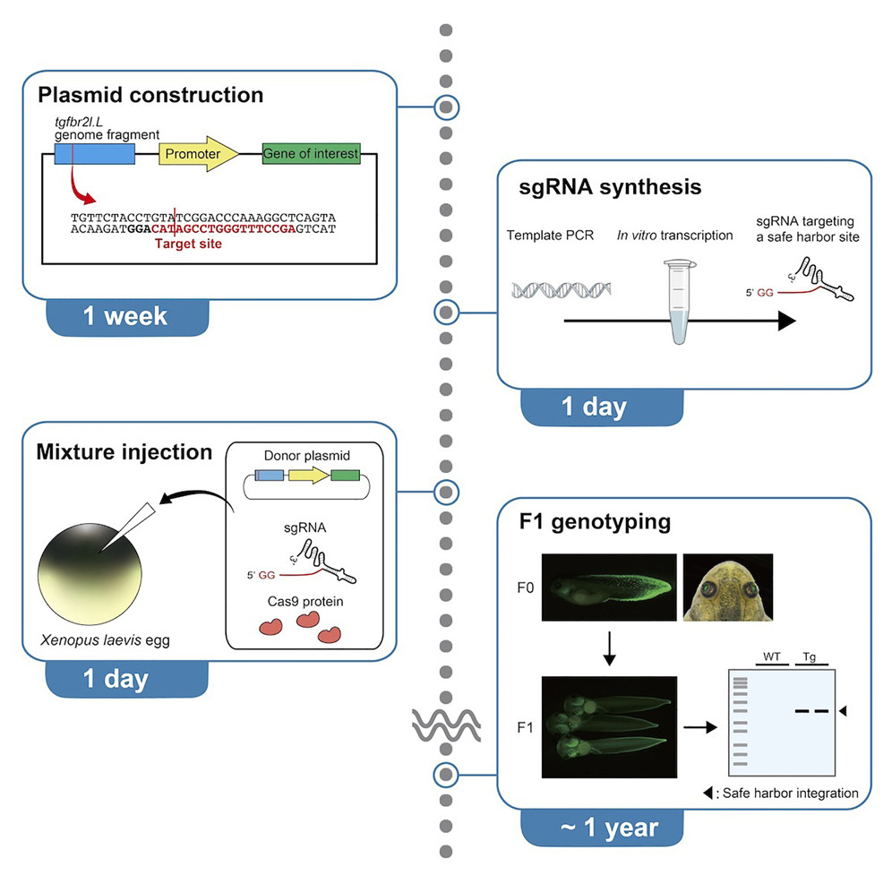 Figure 1. Schematic comparison of the principle of transgenesis using REMI, I-SceI, and NEXTrans methodsTransgenic plasmids are randomly incorporated at multiple loci in the Xenopus laevis genome by the restriction enzyme-mediated integration (REMI)2 and meganuclease (I-SceI)-mediated3 transgenesis methods, whereas the NEXTrans plasmid with CRISPR-Cas9 is integrated into a novel safe harbor site, the tgfbr2l locus. |