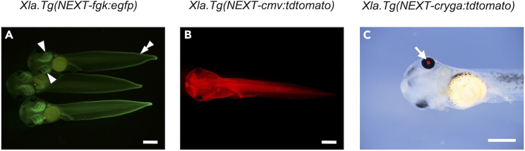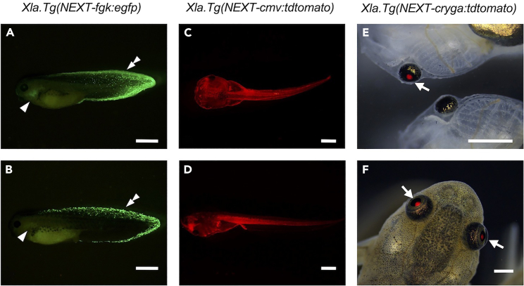 Figure 5. Germline transmission of transgenic X. laevis generated by NEXTransRepresentative photographs of F1 offspring of (A) Xla.Tg(NEXT-fgk:egfp), (B) Xla.Tg(NEXT-cmv:tdtomato), and (C) Xla.Tg(NEXT-cryga:tdtomato) embryos. Arrowheads indicate the gill; double arrowheads indicate the edge of the tail fin; arrow indicates the eye with tdTomato signal. Scale bars = 1 mm. |
