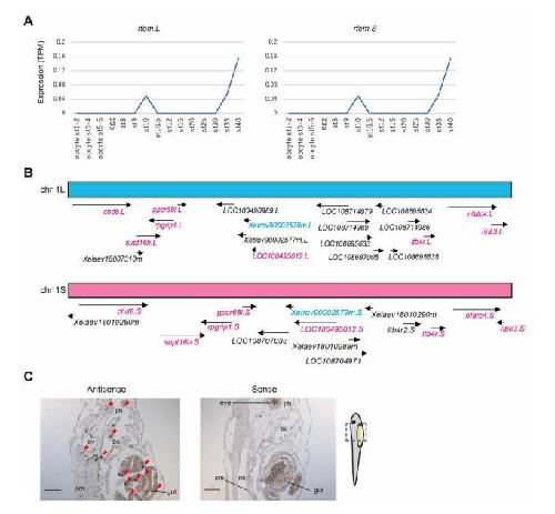 Fig. S1. Analysis of developmental and site-specific expression pattern, and the synteny of rfem.L/S. (A) Expression level of rfem.L and rfem.S in the RNA-seq of the early development period reported by Session et al.[S1]. TPM, transcripts per million reads. (B) Structures of the neighboring regions of rfem.L (Xetrov90002578m.L) and rfem.S (Xetrov90002579m.S) on chromosome 1L and 1S are shown. Genes whose positions are conserved in the L and S chromosomes are indicated in magenta. (C) Representative images of in situ hybridization of rfem.L/S on sagittal sections of the anterior region. Red arrowheads indicate representative signals of rfem.L/S expression. Box with blue dashed lines in the schematic diagrams indicate the location of the section. nc, notochord; sm, skeletal muscle; ov, otic vesicle; ph, pharynx; bc, branchial cavity. Scale bars: 200 μm. Antisense, 8 sections from 6 individuals; sense, 8 sections from 3 individuals. |