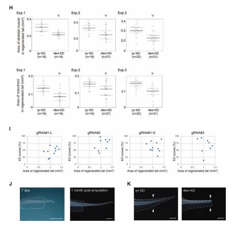 Fig. S2. rfem is not essential for development, but is required for normal tail regeneration. (A) Target sites of guide RNAs used for KD of rfem are indicated by the arrowheads. gRNA#1 targets common sequences in the rfem.L and rfem.S genes. There are no introns within the rfem.L/S genes. (B) Representative images of normally developed 4 dpf tadpoles from the tyr KD and rfem KD groups. Scale bars: 2 mm. (C) Box plots of KO scores for the gRNA #1, #2, and #3 target sites in rfem.L and rfem.S estimated using genomic DNA extracted from the whole body of each rfem KD tadpole with abnormal morphology (ab, n=5) or normal morphology (no, n=5) at 3 days after fertilization. No significant differences were detected using Welch's t test. (D) Other examples of abnormal tail regeneration observed in the rfem KD group. Gray dashed line shows the outline of the tail. Arrowheads indicate amputation site. Scale bars: 2 mm. (E) Regeneration rates of the tyr KD and rfem KD groups. Development: doi:10.1242/dev.200467: Supplementary information Development • Supplementary information Tadpoles from each experimental group were classified into 2 groups depending on the morphology of the regenerated tails: perfect or imperfect (see Methods). Three experiments, including those for which the results are shown in Fig. 2C, were performed independently. The numbers of individuals in each experimental group are indicated below each graph. *P< 0.05 versus tyr KD, Fisher’s exact test. (F, G) Measured (F) area and (G) length of regenerated tails at 7 dpa. Three experiments, including those for which the results are shown in Fig. 2D and 2E, were performed independently. The horizontal lines indicate the 25th, 50th, and 75th percentiles.*P < 0.05, Welch's t test. (H) Measured area of skeletal muscle and notochord in regenerated tail from tadpoles in the tyr KD and rfem KD groups at 7 days after amputation. The data for the first experiment are from the experiment shown in Fig. 2D. The horizontal lines indicate the 25th, 50th, and 75th percentiles.*P < 0.05, Welch's t test. (I) Scatter plots of measured area of regenerated tail at 7 days after amputation (horizontal axis) and KO scores at each gRNA target site estimated using genomic DNA extracted from blood cells (vertical axis) of rfem KD tadpoles. gRNA#1-L and gRNA#1-S represent the gRNA #1 target site in rfem.L and rfem.S, respectively. n=8-10. No correlation was detected between the 2 parameters. (J) Representative images of rfem KD tadpoles showing (left) imperfect regeneration at 7 days after amputation, and (right) the same individual at 1 month after amputation. We traced the regeneration outcomes of 3 rfem KD tadpoles showing imperfect regeneration for 1 to 2 months, and observed that the morphology remained imperfect in all of them. Gray dashed line shows the outline of the tail. Scale bars: 2 mm. (K) Representative images of regenerated tail at 7 days after the second amputation in tadpoles that had been amputated twice (at 4 days after fertilization and at 1 to 2 months after the first amputation). We performed this experiment using 3 rfem KD tadpoles showing imperfect regeneration after the first amputation and 7 tyr KD tadpoles, and observed that the 3 rfem KD tadpoles also showed imperfect regeneration after the second amputation, in contrast to the result of the 6 tyr KD tadpoles which showed perfect regeneration. Scale bars: 2 mm. |