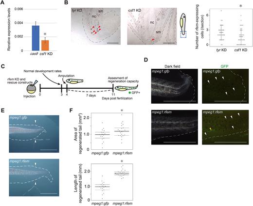 Fig. 4. rfem.L or rfem.S expression in macrophage-like cells is required for tail regeneration. (A) Relative expression levels of rfem.L and rfem.S in the tail stumps at 24 h post-amputation in tadpoles from cas9 and csf1 KD groups. Vertical axes represent relative expression levels normalized to those of ef1a. Data are mean±s.d., n=3. *P<0.05, Welch's t-test. (B) (Left) Representative images of in situ hybridization of rfem.L and rfem.S on sagittal sections of tails from 1 dpa tyr KD and csf1 KD tadpoles. Red arrowheads indicate signals. Blue dashed lines in the schematic diagrams outline the location of the sections. nc, notochord; sm, skeletal muscle. Scale bars: 200 μm. (Right) Number of rfem.L- and rfem.S-expressing cells in sections of 1 dpa tails of tyr KD (31 sections from seven tadpoles) or csf1 KD (34 sections from eight tadpoles) tadpoles. Data are mean±s.d., *P<0.05, Welch's t-test. (C) Design of rfem.L and rfem.S rescue experiment. Normal development ratios are shown in Table S5. (D) Representative images of GFP-expressing cells in regenerated tails at 7 dpa in rfem.L and rfem.S KD tadpoles co-injected with the mpeg1:gfp (control) or mpeg1:rfem (rfem-rescued) constructs. Gray dashed lines indicate the outline of the tail. White arrowheads indicate representative GFP-expressing cells. The yellow arrowhead indicates ectopic expression of GFP in muscle. Scale bars: 1 mm. (E) Representative image of regenerated tails at 7 dpa in a control, and an rfem.L-rescued rfem KD tadpole. Gray dashed lines show the outline of the tail. Arrowheads indicate amputation sites. Scale bars: 2 mm. (F) Measured area and length of regenerated tails at 7 dpa in control (n=17) and rfem.L-rescued (n=21) groups. *P<0.05, Welch's t-test. Data are representative of three experiments; the other results are shown in Fig. S4K,L. |