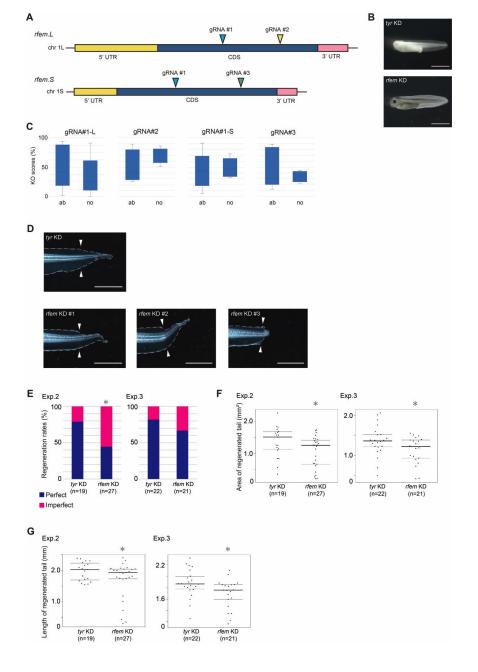 Fig. 2. rfem.L and/or rfem.S are required for normal tail regeneration. (A) Experimental design of rfem.L and rfem.S KD. (B) Representative images of regenerated tails at 7 dpa in tadpoles from tyr KD, and rfem.L and rfem.S KD groups. Gray dashed lines indicate the outline of the tail. Arrowheads indicate amputation sites. Scale bars: 2 mm. Other examples of regenerated tails are shown in Fig. S2D. (C) Regeneration rates of tyr KD (n=18), and rfem.L and rfem.S KD (n=18) groups. Tadpoles from each experimental group were classified into two groups depending on the morphology of the regenerated tails: perfect or imperfect (see Materials and Methods). *P<0.05 versus tyr KD, Fisher's exact test. Data are representative of three experiments; the other results are shown in Fig. S2E. (D,E) Measured (D) area and (E) length of regenerated tails at (D) 3, 5 and 7 dpa, and (E) 7 dpa in tyr KD (n=18), and rfem.L and rfem.S KD (n=18) groups. Data are mean±s.d. in D. In E, the horizontal lines indicate the 25th, 50th and 75th percentiles. Other results are shown in Fig. S2F,G.*P<0.05, Welch's t-test. |