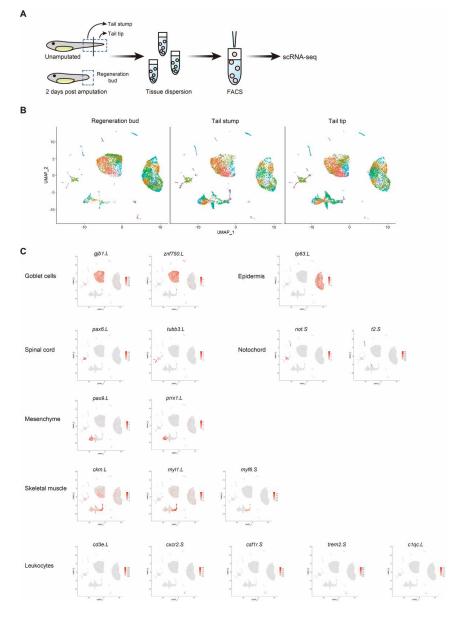 Fig. S3. rfem is expressed in a subset of leukocytes. (A) Schematic drawing of the sample preparation for scRNA-seq. (B) Cells of the regeneration bud, tail stump, and tail tip are plotted separately by UMAP. (C) Expression of genes used for annotation of cell types in clusters plotted by UMAP in which three samples were combined. Markers for goblet cells, epidermis, spinal cord, notochord, mesenchyme, and skeletal muscle are based on a previous study [S2]. Markers for leukocytes are based on; cd3e.L [S2], cxcr2.S [S2], csf1r.S [S3], [S4] [S5], trem2.S[S6], [S7], and c1qc.L [S8], [S9], [S10]. (D) (upper) rfem.L and (lower) rfem.S expression in each sample. Expressing cells are indicated by red dots. (E) Expression levels of rfem.L and rfem.S in tail stumps at 48 h after amputation of il11 KD and control tadpoles in the RNA-seq of a previous study (Tsujioka et al., 2017) are shown in TPM. n=3. (F) Expression of (left) il-11ra.L and (right) rfem.L merged with the expression of il-11ra.L is shown in a UMAP plot in which three samples were combined. Expression of il-11ra.L and rfem.L is plotted in green and red, respectively. No cells coexpressing il-11ra.L and rfem.L were detected. |