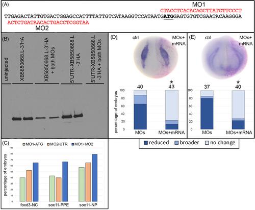 FIGURE 3 Validation of efficacy and specificity of the XB5850668.L antisense morpholino oligonucleotides. (A) Sequence of a portion of the 5′UTR (to the left of the translational start ATG [underlined]) and the coding region (to the right of the ATG) of XB5850668.L mRNA. In red are the two antisense morpholino oligonucleotides (MO1, MO2) that were used to block translation of endogenous XB5850668.L mRNA. These MOs bind with no mismatches to LOC100037047 and BG88539 mRNAs, but not to other closely related variants (e.g., XM_041568315, XM_018224208). (B) Western blot of 1-egg equivalent lysates from oocytes injected with HA-tagged mRNAs containing (5′UTR-XB5850889.L-3′HA) or not containing (XB5850889.L-3′HA) the 5′UTR to which MO2 binds. Both mRNAs are efficiently translated in the absence of an equimolar mixture of MO1 + MO2. In the presence of both MOs, 5′UTR-XB5850889.L-3′HA translation is blocked, whereas XB5850889.L-3′HA translation is detected due to lack of MO2 binding but reduced due to binding of MO1. Two lanes per condition were run on each blot and assays were run in duplicate two independent times. Uninjected = lysate from oocytes that were not injected with either mRNA. (C) The percentage of embryos that showed reduced foxd3 expression in the neural crest (foxd3-NC), reduced sox11 expression in the preplacodal ectoderm (sox11-PPE) or broader expression of sox11 in the neural plate (sox11-NP). While MO1 (green bars) and MO2 (orange bars) both caused these phenotypes, the combination of an equimolar mixture of both MOs (blue bars) resulted in the greatest effect. Therefore, an equimolar combination of MO1 + MO2 was used in all knock-down experiments (see Figures 4 and 5). (D) Neural crest foxd3 expression domain at st 16 is unchanged on the side injected with a combination of both MOs and MO-insensitive mRNA (MOs + mRNA); pink dots indicate lineage-labeled nuclei on the injected side. Bar graph indicates that the foxd3 expression domain is reduced in the majority of MO-injected embryos (see also Figure 4F, G), whereas the majority of embryos have a normal foxd3 expression domain with co-injection of MO-insensitive mRNA. The percentage of embryos showing reduced (dark blue), broader (medium blue) or no change (light blue) in foxd3 expression domains are significantly different between conditions (*p < .05, Chi-square test). Numbers above bars indicate number of embryos analyzed. (E) PPE six1 expression domain at st 17 is unchanged on the side injected with a combination of both MOs and MO-insensitive mRNA (MOs + mRNA); pink dots indicate lineage-labeled nuclei on the injected side. Bar graph indicates that the six1 expression domain is reduced in the majority of MO-injected embryos (see also Figure 4H, I), whereas the majority of embryos have a normal six1 expression domain with co-injection of MO-insensitive mRNA. The percentage of embryos showing reduced (dark blue), broader (medium blue) or no change (light blue) in six1 expression domains are significantly different between conditions (*p < .05, Chi-square test). Numbers above bars indicate number of embryos analyzed. |