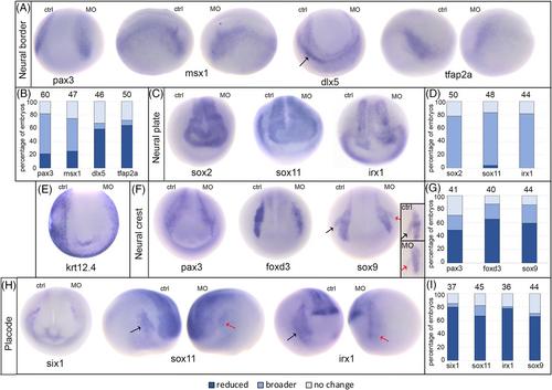 FIGURE 4 Loss of endogenous XB5850668.L alters gene expression in each ectodermal domain. (A) The expression domains of neural border genes were differentially affected by loss of XB5850668.L. Those associated later in development with the lateral neural plate and neural crest (pax3, anterior view; msx1, side views) were predominantly broader on the MO side of the embryo compared to the control side (ctrl) of the same embryo. Those associated later in development with epidermis and PPE (dlx5, anterior view; tfap2a, side views) were predominantly reduced in size and intensity on the MO side of the embryo compared to the control side (ctrl) of the same embryo. Arrow in dlx5 embryo points out the major domain (on the control side) that was analyzed. Dorsal is to the top of each image. (B) Percentage of embryos in which neural border gene expression domains were reduced in size (dark blue), broader (medium blue), or did not change (light blue) when analyzed at the end of gastrulation (st 13). The number of embryos analyzed for each gene is at the top of each bar. (C) The expression domains of three neural plate genes (sox2, sox11, irx1) were broader upon loss of XB5850668.L (MO) compared to the control side (ctrl) of the same embryo. Anterior views with dorsal to the top. (D) Percentage of embryos in which neural plate expression domains were reduced in size (dark blue), broader (medium blue) or did not change (light blue) when analyzed at neural plate stages (st 16–18). The number of embryos analyzed for each gene is at the top of each bar. (E) The expression domain of epidermis-specific keratin (krt12.4) was reduced, that is, further from the midline, on the MO side of the embryo (95.45%, n = 22). Anterior view with dorsal to the top. (F) The expression domains of three genes associated with neural crest (pax3, foxd3, sox9) were predominantly reduced in size on the XB5850668.L MO side of the embryo compared to the control side (ctrl) of the same embryo. For pax3, the most noticeable staining at this stage was in the hatching gland precursors. The black arrow on the sox9 embryo denotes the control otic placode domain and the red arrow denotes the otic placode domain on the MO side. Anterior views with dorsal to the top. Inset shows sox9 otic placode expression in a different embryo, demonstrating a reduced domain on the MO side (red arrow) compared to control side (black arrow). Lateral views with dorsal to the top. (G) Percentage of embryos in which neural crest expression domains were reduced (dark blue), broader (medium blue) or did not change (light blue) when analyzed at neural plate stages (st 16–18). The number of embryos analyzed for each gene is at the top of each bar. (H) The expression domains of three PPE genes (six1, anterior view; sox11, side views; irx1, side views) were reduced on the XB5850668.L MO side of the embryo compared to the control side (ctrl) of the same embryo. For sox11 and irx1, the black arrows denote the control PPE domain and the red arrows denote the PPE domain on the MO side. Dorsal is to the top of each image. (I) Percentage of embryos in which PPE expression domains were reduced (dark blue), broader (medium blue) or did not change (light blue) when analyzed at neural plate stages (st 16–18). The number of embryos analyzed for each gene is at the top of each bar. |