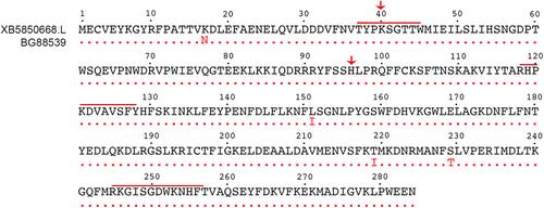 FIGURE 1 Clone BG88539 encodes a sulfotransferase. Amino acid sequence of BG88539 (red font) is identical (red dots) to that of XB5850668.L (black font, NM_001097778; and to LOC100037047, BC130199.1, not shown) except at amino acids #17, #151, #219, and #229. The highly conserved sulfotransferase domain extends from residues 30-276 and includes signature sequences (red bars) for the 5′ phosphosulfate binding loop (PSB loop; aa 38-45; aa 118-128) and a C-terminal P-loop motif (aa 245-257) that are required for PAPS binding. Red arrows denote the amino acids (K40, H96) that were experimentally altered. |