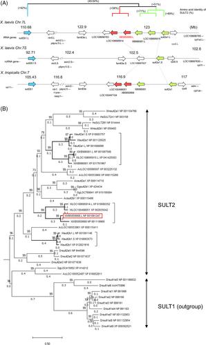 FIGURE 2 Chromosomal localization of the members of SULT2 gene family including XB5850668.L in Xenopus laevis and Xenopus tropicalis, and their phylogenetic relationships. (A) The loci of SULT2 family genes on Xenopus chromosome 7. The gene cluster consists of six members on the L-subgenome and two members on the S-subgenome in the allotetraploid X. laevis, and five members in the diploid X. tropicalis. Four members were lost from the S-subgenome in X. laevis. This chromosomal region showed shared synteny between X. laevis and X. tropicalis (see also Table 1), but little synteny across species from mammals to a teleost (see also Table 2). The three groups in the Xenopus SULT2 gene family are shown by bold arrows in blue, red, and green, and their phylogenetic relationships are depicted with amino acid identity (%) above the chromosomal maps. B: Phylogenetic tree of the vertebrate SULT2 gene family. The tree was constructed with the maximum likelihood method from eight X. laevis (Xl), five X. tropicalis (Xt) and 16 other vertebrate SULT2 amino acid sequences and with nine Danio rerio (Dr) SULT1 amino acid sequences as an outgroup. Node values represent the Chi-square-based parametric values returned by the approximate likelihood ratio test. Gene and protein IDs, and annotations and other information for each member are shown in Table 1. The first two letters of the gene names denote the species: Ac, Anolis carolinensis (green anole); Dr, Danio rerio (zebrafish); Gg, Gallus gallus (chicken); Hs, Homo sapiens (human); Mm, Mus musculus (house mouse); Xl, Xenopus laevis (African clawed frog); and Xt, Xenopus tropicalis (western clawed frog). The last letter (S or L) of the gene names for Xenopus laevis indicate homeologs derived from either the S- or L-subgenome. The three groups in the Xenopus SULT2 gene family are shown by bold branches and a bracket, and the XB5850668.L gene is outlined by a red rectangle. |