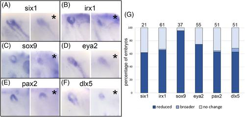 FIGURE 5 XB5850668.L is required for otic vesicle gene expression. (A) Knockdown of XB5850668.L translation on one side of the larva (asterisk, right panel) results in reduced expression of six1 in the otic vesicle (OV, blue circle) compared to the control side of the same embryo (left panel). (B) Knockdown of XB5850668.L translation on one side of the larva (asterisk, right panel) results in reduced expression of irx1 in the OV (blue circle) compared to the control side of the same embryo (left panel). (C) Knockdown of XB5850668.L translation on one side of the larva (asterisk, right panel) results in reduced expression of sox9 in the OV (blue circle) compared to the control side of the same embryo (left panel). (D) Knockdown of XB5850668.L translation on one side of the larva (asterisk, right panel) results in reduced expression of eya2 in the OV (blue circle) compared to the control side of the same embryo (left panel). (E) Knockdown of XB5850668.L translation on one side of the larva (asterisk, right panel) results in reduced expression of pax2 in the OV (blue circle) compared to the control side of the same embryo (left panel). (F) Knockdown of XB5850668.L translation on one side of the larva (asterisk, right panel) results in reduced expression of dlx5 in the OV (blue circle) compared to the control side of the same embryo (left panel). (G) Percentage of embryos in which OV expression domains of genes were reduced (dark blue), broader (medium blue) or did not change (light blue) when analyzed at larval stages (st 28–32). The number of embryos analyzed for each gene is on top of each bar. |