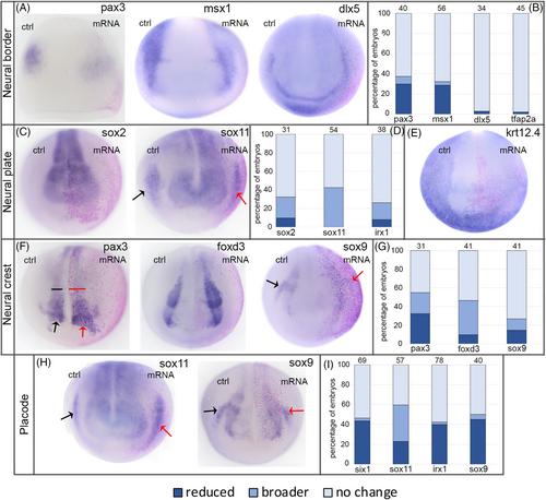 FIGURE 6 Increasing XB5850668.L has minimal effects on ectodermal gene expression domains. (A) The expression domains of neural border genes were mostly unaffected by increased XB5850668.L. However, a small percentage of those associated later in development with the lateral neural plate and neural crest (pax3, msx1, anterior views) showed reduced intensity of expression on the mRNA-injected side of the embryo (pink lineage-labeled nuclei) compared to the control side (ctrl) of the same embryo. dlx5, which later in development is associated with epidermis and PPE, was unaffected by increased XB5850668.L (anterior view); the same was found for tfap2a expression (shown in 2B). Dorsal is to the top of each image. (B) Percentage of embryos in which neural border expression domains were reduced (dark blue), broader (medium blue), or did not change (light blue) when analyzed at the end of gastrulation (st 13). The number of embryos analyzed for each gene at the top of each bar. (C) The expression domains of neural plate genes were mostly unaffected by increased XB5850668.L. However, a small percentage of embryos showed broader neural plate domains on the mRNA-injected side of the embryo (pink lineage-labeled nuclei) compared to the control side (ctrl) of the same embryo. Arrows in sox11 show its PPE expression domain on the control (black) and mRNA-injected (red) sides. In this case, increased XB5850668.L resulted in a narrower sox11 PPE domain. Anterior views with dorsal to the top. (D) Percentage of embryos in which neural plate expression domains were reduced (dark blue), broader (medium blue) or did not change (light blue) when analyzed at neural plate stages (st 16–18). The number of embryos analyzed for each gene is at the top of each bar. (E) The expression of epidermis-specific keratin (krt12.4) was reduced on the mRNA-injected side in only 25% of embryos; there was no change in expression in 75% of embryos (n = 56). Anterior view with dorsal to the top. (F) The expression domains of neural crest genes were mostly unaffected by increased XB5850668.L (see 6H for sox9). However, small percentages of embryos showed a broader domain (pax3, foxd3) or reduced staining intensity (sox9) on the mRNA-injected side of the embryo (pink lineage-labeled nuclei) compared to the control side (ctrl) of the same embryo. For pax3, both the neural crest (bracket) and hatching gland (arrow) domains were affected. Arrows in sox9 show its otic placode domain on the control (black) and mRNA-injected (red) sides, which frequently was reduced (see also 6H, I). Anterior views with dorsal to the top. (G) Percentage of embryos in which neural crest expression domains were reduced (dark blue), broader (medium blue) or did not change (light blue) when analyzed at neural plate stages (st 16–18). The number of embryos analyzed for each gene is at the top of each bar. (H) The expression domains of PPE/placode genes were mostly unaffected by increased XB5850668.L. However, small percentages of embryos showed a broader domain (sox11) or a reduced domain (sox11 in 6C; sox9 and also 6F) on the mRNA-injected side of the embryo (pink lineage-labeled nuclei) compared to the control side (ctrl) of the same embryo. Arrows indicate PPE/placode domains on the control (black) and mRNA-injected (red) sides. Anterior views with dorsal to the top. (I) Percentage of embryos in which PPE expression domains were reduced (dark blue), broader (medium blue) or did not change (light blue) when analyzed at neural plate stages (st 16–18). The number of embryos analyzed for each gene is at the top of each bar. |