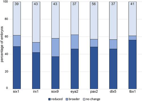 FIGURE 7 XB5850668.L gain-of-function has minimal effects on otic vesicle gene expression. Percentage of embryos in which OV expression domains were reduced (dark blue), broader (medium blue) or did not change (light blue) when analyzed at larval stages (st 28–32). The number of embryos analyzed for each gene is inside the bars. |