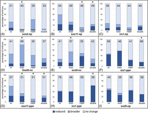 FIGURE 8 Mutation of amino acids in the PAPS binding (H40I) or catalytic (H96F) domains tend to attenuate effects of wild type XB5850668.L gain-of-function on ectodermal gene expression domains. The percentage of embryos in which the expression domain was reduced (dark blue), broader (medium blue) or did not change (light blue) after injections of mRNAs (100 pg) encoding wild type (wt) or mutated versions (K40I, H96F, double = K40I + H96F) of XB5850668.L. The number of embryos analyzed is inside each bar. * indicates mutant mRNA phenotype frequencies that were significantly different from wt at the p < .05 level (Chi square test). (A) sox2 neural plate (np) expression domain changes. (B) sox11 neural plate (np) expression domain changes. (C) irx1 neural plate (np) expression domain changes. (D) foxd3 neural crest (nc) expression domain changes. (E) sox9 neural crest (nc) expression domain changes. (F) six1 preplacodal (ppe) expression domain changes. (G) sox11 preplacodal (ppe) expression domain changes. (H) irx1 preplacodal (ppe) expression domain changes. (I) sox9 otic placode (op) expression domain changes. |