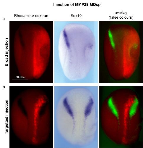 S1 Fig. Effect of broad or targeted MMP28 knockdown on Sox10 expression. (a, b) Representative images of embryos injected with MMP28-MOspl in a broad manner (a, n = 15), overlapping with the placodal domain or in a targeted manner (b, n = 15) targeting the neural fold and medial crest subregion but excluding the placodes, analysed by in situ hybridization against Sox10. MO was co-injected with rhodamine-dextran for tracing (red). |