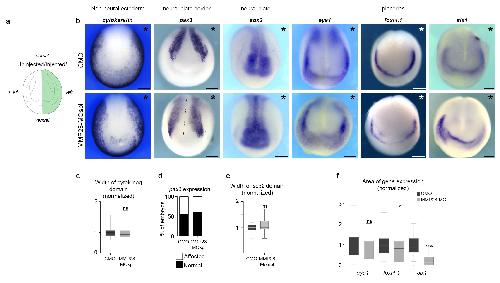 S2 Fig. Effect of MMP28 knockdown on ectoderm patterning. (a) Diagram representing the anterior view of Xenopus laevis neurula (Stage 16). Embryos were injected on their left-hand side (green). (b) Representative images of embryos injected with either control MO (CMO) or MMP28-MOspl after in situ hybridization for cytokeratin, pax3, sox2, eya1, foxi4.1 and six1, asterisks mark the injected side. (c) Ratio of the width of the cytokeratin-negative domain from the midline for the injected and uninjected sides, normalised to the CMO condition; CMO (n = 43), MMP28MOspl (n = 63). (d) Percentages of embryos with normal or affected expression of pax3 after injection of CMO (n = 40) or MMP28-MOspl (n = 20). (e) Ratio of the width of the sox2-positive domain from the midline for the injected and uninjected sides, normalised to the CMO condition; (CMO n = 20), MMP28MOspl (n = 15). (f) Ratio of area of gene expression for the injected and uninjected sides, normalised to the CMO condition; eya1: (CMO n = 15), MMP28MOspl (n = 14); foxi4.1: CMO (n = 27), MMP28MOspl (n = 37); six1: CMO (n = 20), MMP28MOspl (n = 49). Statistics: Student t tests c, p = 0.3510; e, p = 0.7125; f, eya1, p = 0.3572; foxi4.1, p = 0.3512; six1, p < 0.0001. For panel (d), contingency table T = 0.135, α = ns. Scale bar, 200 μm. |