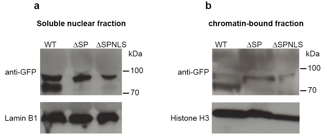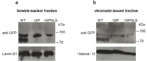 S8 Fig. Processing of MMP28 requires entry into the secretion pathway. (a, b) Western blots using anti-GFP antibody after cell fractionation from embryos expressing MMP28-GFP (WT), MMP28-ΔSP (deletion of the secretion peptide), or MMP28-ΔSPNLS (deletion of the secretion peptide and insertion of a strong NLS in C-terminus) on the soluble (a) and chromatin-associated (b) nuclear fractions, representative image from 2 independent experiments. Lamin B1 and Histone H3 were used as controls for the soluble and chromatin-associated fractions, respectively. Note that the lower band of MMP28 (circa 70kDa) is not detected in the ΔSP and ΔSPNLS conditions indicating that the pro-domain of MMP28 is not removed if MMP28 is prevented from entering the secretion pathway. |
