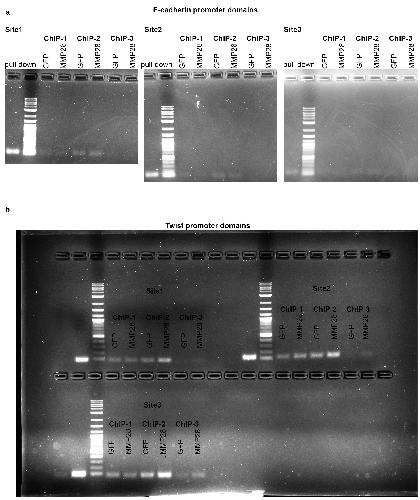S9 Fig. PCR after chromatin immunoprecipitation with GFP, MMP14-GFP, MMP28-GFP, and Twist-GFP. |