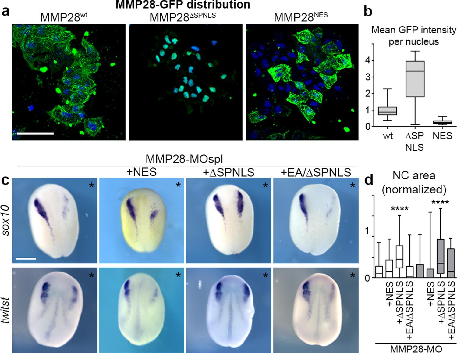 Fig 6. Active nuclear MMP28 is required for the expression of twist. (a) Neural crest expressing GFP-tagged versions of MMP28wt, MMP28ΔSPNLS, and MMP28NES cultured on Fibronectin, scale bar, 100 μm. (b) Mean intensity of the GFP signal per nucleus from 3D confocal stacks normalised to mean intensity of MMP28-GFPwt, WT (n = 85) from 3 explants, ΔSPNLS (n = 39) from 2 explants, NES (n = 206) from 2 explants. (c) Phenotype of MMP28-MO injected embryos co-injected with MMP28NES-GFP, MMP28ΔSPNLS-GFP, or MMP28EA/SPNLS-GFP and analysed for twist and sox10 expression, scale bar, 250 μm. Asterisks mark injected side. (d) Area of neural crest gene expression normalised to non-injected side from 7 independent experiments. Number of embryos per condition, from left to right: 137, 47, 94, 28, 60, 49, 70, and 18. ANOVA followed by multiple comparisons, **** p < 0.0001. Numerical data from all graphs can be found in the supporting S1 Data file. MMP, matrix metalloproteinase; NC, neural crest; NES, nuclear export signal. |