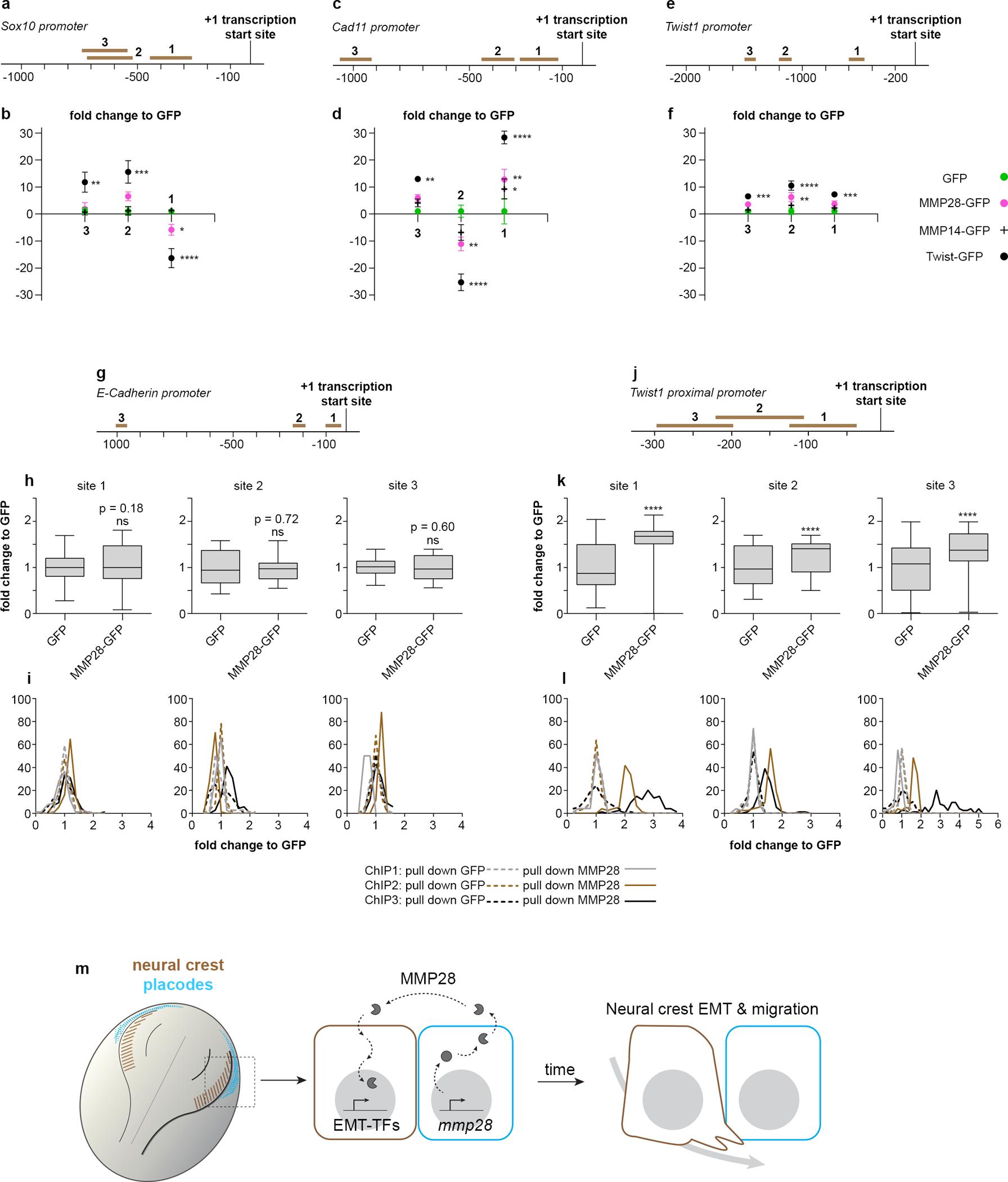 Fig 7. MMP28 interacts with some domains of cadherin-11 and twist promoters. (a–f) ChIP-PCR after ChIP with GFP (green dots), MMP28-GFP (magenta dots), MMP14-GFP (black crosses), and Twist-GFP (black dots) for 3 domains on the sox10 (a, b), cadherin-11 (c, d), and twist (e, f) promoters, normalised to signals in GFP pull down. From 3 technical replicates, mean band intensity from gels are plotted, error bars represent the standard error of the mean. Original uncropped gels used for quantification are provided in S9 Fig. (g–l) ChIP-PCR after ChIP with GFP or MMP28-GFP for 3 domains on the e-cadherin (g–i) or twist (j–l) promoters, normalised to signals in GFP pull down. From 3 independent ChIP assays (biological replicates). Mean pixels intensity from histogram analyses from gels are shown as box and whiskers plots (h, k) or as frequency distribution per ChIP (i, l). Original uncropped gels used for quantification are provided in S12 Fig. (m) Diagram of a dorsal view of a Xenopus embryo with neural crest in brown and placodes in cyan. MMP28 from placodes is imported into neural crest’s nuclei to promote EMT. Numerical data from all graphs can be found in the supporting S1 Data file. ChIP, chromatin immunoprecipitation; EMT, epithelial–mesenchymal transition; MMP, matrix metalloproteinase. |