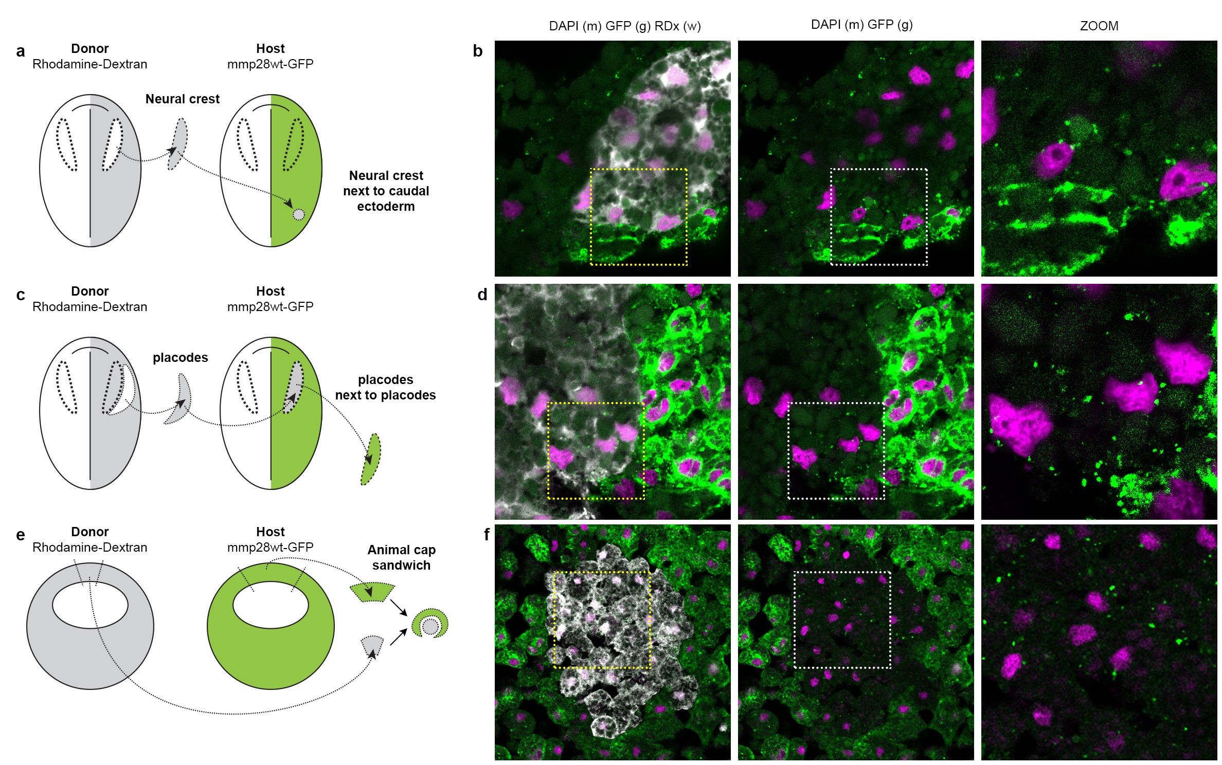 S7 Fig. Paracrine import of MMP28-GFP is not restricted to neural crest placodes interactions. (a, b) Graft of neural crest cells labelled with rhodamine-dextran next to caudal ectoderm expressing MMP28-GFP. (c, d) Graft of placodals cells labelled with rhodamine-dextran next to placodal cells expressing MMP28-GFP. (e, f) Animal cap sandwiches between animal caps expressing MMP28-GFP and animal caps labelled with rhodamine-dextran. Counterstaining with DAPI (magenta). Rhodamine-dextran (grey), MMP28-GFP (green). No anti-GFP staining was performed on these samples. Scale is given by the nuclei that have a diameter of 12 μm on average. Numbers and quantifications of internalisation and nuclear import are shown on Fig 5, panel (c). |