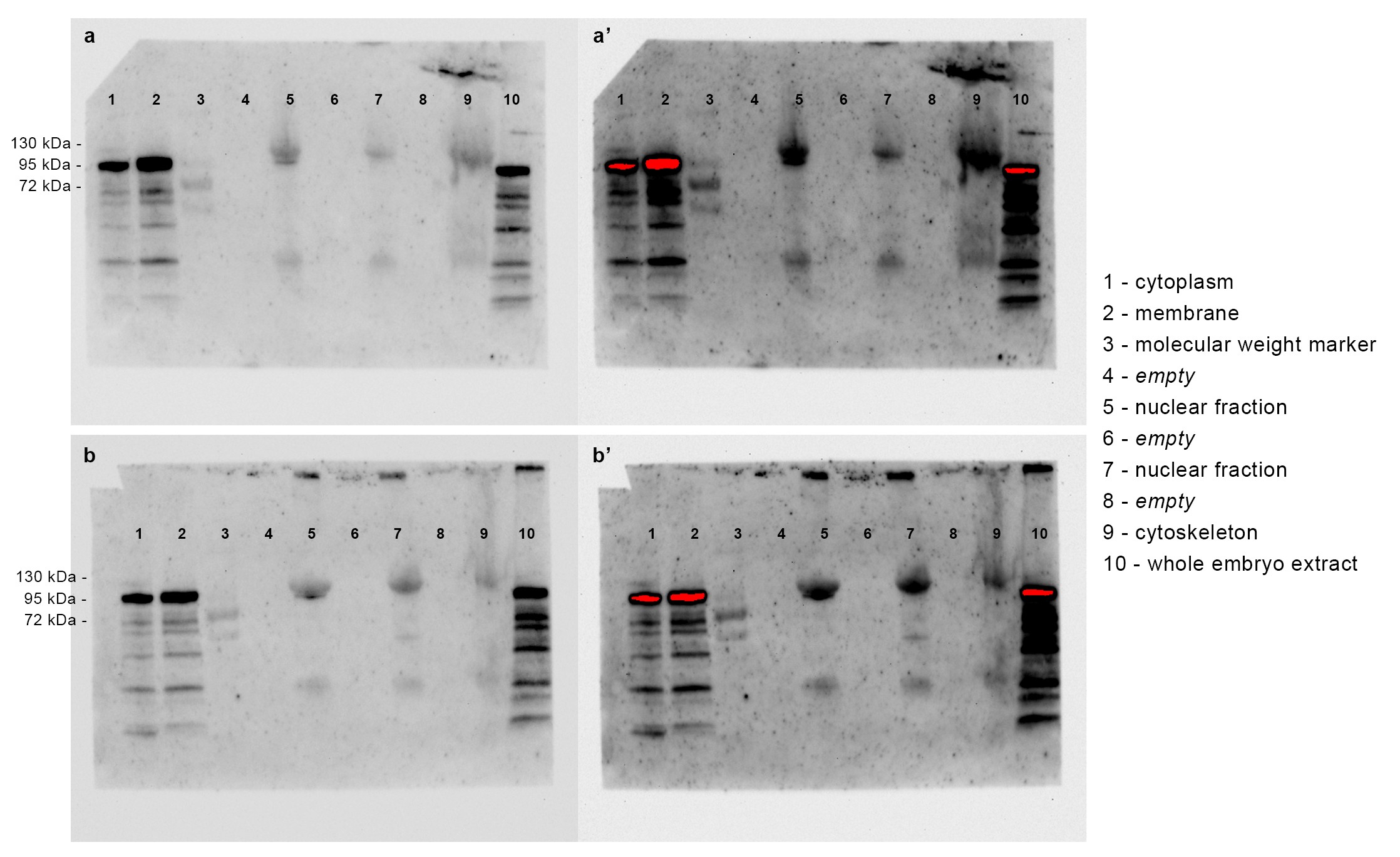 S10 Fig. Cell fractionation after expression of MMP14-GFP. (a–b’) Western blots using anti-GFP antibody after cell fractionation from embryos expressing MMP14-GFP; (a) and (b) are 2 fractionations from independent samples, and (a’) and (b’) are the same blots as (a) and (b) with exposure time optimised for band detection in the nuclear fractions. |