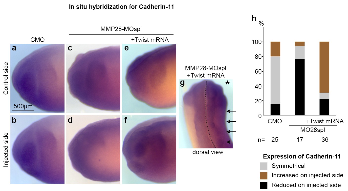 S11 Fig. Twist is sufficient to drive ectopic Cadherin-11 expression. (a, b) Embryos injected with control MO. (c, d) Embryos injected with MMP-MOspl. (c–f) Embryos injected with MMP28-MOspl and Twist mRNA. (g) Dorsal view of the embryo shown in (e) and (f). (h) Percentage of embryos with expression of Cadherin-11 that is either symmetrical (grey) or increased/reduced (brown/black) on the injected side. Note that all embryos that had an increased expression of Cadherin-11 in the MMP28-MOspl+Twist mRNA condition also had ectopic expression of Cadherin-11 in the ectoderm as seen on panel (g) (arrows). Asterisk indicates the injected side. |