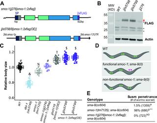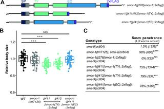 Fig 4. When expressed at the endogenous locus, neither SMOC-1(TY) nor SMOC-1(EC) is fully functional in regulating BMP signaling. (A) Diagrams depicting the full-length smoc-1, as well as truncated smoc-1(TY) and smoc-1(EC) at the endogenous locus. All of them are tagged with a 2xFLAG tag at the C-terminal end. Color keys are the same as in Fig 1A. (B) Relative body sizes of worms at the same developmental stage WT (WT set to 1.0). ***P < 0.001; ND: no difference (ANOVA followed by Tukey HSD). WT: N = 54. tm7125: N = 51. jj441: N = 51. jj411: N = 47. jj412: N = 41. (C) Table showing the penetrance of the Susm phenotype of smoc-1(TY) and smoc-1(EC) as compared to the smoc-1(0) worms. a The lack of M-derived CCs phenotype is not fully penetrant in sma-9(cc604) mutants. b Data from DeGroot and colleagues [12]. Statistical analysis was conducted by comparing double mutant lines with the sma-9(cc604) single mutants. ***P < 0.001; ND: no difference (unpaired two-tailed Student’s t test). Original data sets are in S1 Data. CC, coelomocyte; EC, extracellular calcium-binding; SMOC, secreted modular calcium-binding protein; TY, thyroglobulin type-1; WT, wild type. https://doi.org/10.1371/journal.pbio.3002272.g004 |