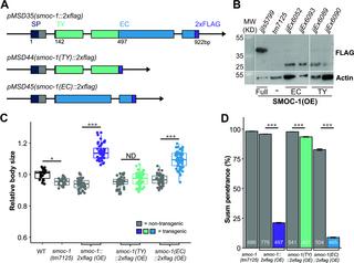 Fig 3. The EC domain of SMOC-1 is sufficient to regulate BMP signaling when overexpressed. (A) Diagrams depicting the genomic constructs expressing full-length SMOC-1::2xFLAG (pMSD35), SMOC-1(TY)::2xFLAG (pMSD44), and SMOC-1(EC)::2xFLAG (pMSD45). All plasmids contain the same 2 kb promoter and 2 kb 3′ UTR of smoc-1. SMOC-1(TY) ends at amino acid 134, while SMOC-1(EC) starts at amino acid 135, both containing the same SMOC-1 SP, and the 2xFLAG tag. (B) Western blot of 50 gravid adults of each indicated genotype, probed with anti-FLAG (top) and anti-actin antibodies (bottom). The strain overexpressing full-length SMOC-1::2xFLAG (jjIs5799) is an integrated transgenic strain, while those overexpressing SMOC-1(TY)::2xFLAG (jjEx6089 and jjEx6090) or SMOC-1(EC)::2xFLAG (jjEx6052 and jjEx6093) carry the transgenes as extra chromosomal arrays, thus the expression level appeared lower due to random loss of the array during each mitotic division. (C) Relative body sizes of strains carrying indicated versions of smoc-1 as extra chromosomal arrays in a smoc-1(tm7125) null background at the same developmental stage (WT set to 1.0). For panels C and D, gray indicates non-transgenic worms that do not express any smoc-1. Two independent transgenic lines were measured and combined for each plasmid being tested here. Statistical analysis was done by comparing transgenic strains with non-transgenic counterparts. ***P < 0.001; *P < 0.01, ND: no difference (ANOVA followed by Tukey HSD). WT: N = 23. tm7125: N = 25. Full-length smoc-1 (transgenic: N = 44; non-transgenic: N = 41). smoc-1(TY) (transgenic: N = 40; non-transgenic: N = 39). smoc-1(EC) (transgenic: N = 66; non-transgenic: N = 47). (D) Summary of the Susm penetrance of strains carrying indicated versions of smoc-1 in a smoc-1(tm7125); sma-9(cc604) background. The Susm penetrance refers to the percent of animals with 1 or 2 M-derived CCs as scored using the arIs37(secreted CC::GFP) reporter. For each genotype, 2 independent isolates were generated (as shown in the strain list), the Susm data from the 2 isolates were combined and presented here. Number of animals scored are noted on each bar. Statistical analysis was done to compare transgenic strains with non-transgenic counterparts. See panel C for color legend. ***P < 0.001 (general linear model, Wald statistic). Original data sets are in S1 Data. Original images of western blots can be found in S1 Raw Images. BMP, bone morphogenetic protein; EC, extracellular calcium-binding; SMOC, secreted modular calcium-binding protein; SP, signal peptide; TY, thyroglobulin type-1; WT, wild type. https://doi.org/10.1371/journal.pbio.3002272.g003 |