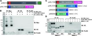 Fig 8. Co-IP results testing the model for tripartite complex formation. (A) Predicted structure of a complex formed between LON-2, SMOC-1, and a homodimer of the DBL-1 mature domain. The membrane-anchoring region of LON-2 lies at the bottom of the panel. (B) The same structure prediction as in A, but shown from the “top.” (C) Diagrams of LON-2, SMOC-1, and DBL-1 expression constructs used in the Drosophila S2 cell expression system. (D) Results of co-IP experiments testing the interaction between LON-2::Myc and HA::DBL-1 prodomain::FLAG::DBL-1 mature domain in the presence or absence of SMOC-1::V5. IP with anti-FLAG beads, or anti-Myc beads, and IB with anti-Myc, anti-V5 or anti-FLAG antibodies, as indicated. Note that immunoprecipitation of FLAG::DBL-1mature domain with anti-FLAG beads can pull down LON-2::Myc only in the presence of SMOC-1::V5. No FLAG::DBL-1mature protein was detected when IP was performed using anti-Myc antibodies, very likely due to the low amount of FLAG::DBL-1mature protein in the co-IP experiments, as FLAG::DBL-1mature protein was not detectable in the Input lanes where approximately 1% of materials used for the co-IP experiments were loaded. Experiments were independently repeated in triplicate, with representative results shown in this figure. Original images of western blots can be found in S1 Raw Images. co-IP, coimmunoprecipitation; EC, extracellular calcium-binding; IB, immunoblot; IP, immunoprecipitation; SMOC, secreted modular calcium-binding protein; TY, thyroglobulin type-1. https://doi.org/10.1371/journal.pbio.3002272.g008 |